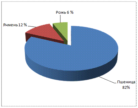 В хозяйстве имеются брошенные земли, которые не обрабатывались на протяжении 2 лет. Существенным резервом увеличения производства продукции в растениеводстве является улучшение структуры посевных площадей, то есть увеличение доли более урожайных культур в общей посевной площади. На рисунке 3 представлена структура посевов зерновых культур общества. Посевная площадь пшеницы составляет 4676 га, ржи – 328 га, ячменя – 751 га. Большую часть посевной площади ООО «Богословское» - 82 % занимает пшеница, которая является основной культурой общества, 12 % площади сельскохозяйственных угодий приходится на ячмень и 6% на рожь. Рожь в 2009 г. сеялась в первый раз, как пробная, поэтому и занимает такую малую часть.
