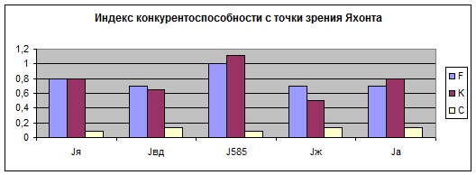 Kя = 1+1+1+0+0+1/6 = 0,66 Kг = 0,5+1+1+1+0+0/6 = 0,58 Kвд = 0,5+1+0+0+1+0/6 = 0,41 K585 = 1+0,5+1+0+1+1/6 = 0,75 Kж = 0,5+0,5+0+0+1+0/6 = 0,41 Kа = 0,5+1+0+1+1+0/6 = 0,58 С точки зрения потребителя с доходом средним и ниже Kя = 1+1+1+0+0+1/3= 1,3 Kг = 0,5+1+1+1+0+0/3= 1,16 Kвд = 0,5+1+0+0+1+0/3 = 0,83 K585 = 1+0,5+1+0+1+1/3 = 1,5 Kж = 0,5+0,5+0+0+1+0/3 = 0,6 Kа = 0,5+1+0+1+1+0/3 = 1,16 С точки зрения потребителя с доходом выше среднего Kя = 1+1+1+0+0+1/6 = 0,66 Kг = 0,5+1+1+1+0+0/6 = 0,58 Kвд = 0,5+1+0+0+1+0/6 = 0,41 K585 = 1+0,5+1+0+1+1/6 = 0,75 Kж = 0,5+0,5+0+0+1+0/6 = 0,41 Kа = 0,5+1+0+1+1+0/6 = 0,58 С точки зрения Яхонта: