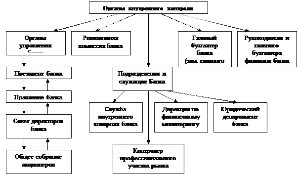 Рис. 1.1. Структура органов внутреннего контроля Банка Контроль за финансово-хозяйственной деятельностью ОАО «Балтийский банк» осуществляется Ревизионной комиссией, которая избирается Общим собранием акционеров Банка сроком на 1 год в количестве не менее 3-х членов. Проверки осуществляются Ревизионной комиссией по итогам деятельности Банка за год, а также в любое время по инициативе Ревизионной комиссии Банка, Совета директоров Банка, по решению Общего собрания акционеров Банка или по требованию акционеров (акционера), владеющих в совокупности не менее чем 10% голосующих акций Банка. Служба внутреннего контроля по собственной инициативе докладывает Совету Директоров о вопросах, возникающих в ходе осуществления своих функций, и предложениях по их решению, а также раскрывает эту информацию Президенту и Правлению Банка. Деятельность Банка подлежит ежегодной проверке аудиторской организацией, имеющей в соответствии с законодательством Российской Федерации лицензию на осуществление таких проверок. Аудиторская проверка Банка осуществляется в соответствии с законодательством Российской Федерации. Аудитора Банка утверждает Общее собрание акционеров Банка. Размер оплаты услуг аудитора определяется Советом директоров Банка. Аудиторская организация обязана составить заключение о результатах аудиторской проверки, содержащее сведения о достоверности финансовой отчетности Банка, выполнении им обязательных нормативов, установленных Банком России, качестве управления Банком, состоянии внутреннего контроля и другие положения, определяемые федеральными законами и Уставом Банка. Аудиторское заключение направляется в Банк России в порядке и в сроки, установленные Банком России. Построенная таким образом система внутреннего контроля и аудита позволяет выявлять существующие риски в деятельности, как отдельных подразделений, так и банка в целом. 1.4. Риски в деятельности Банка. Назначение, порядок формирования и использования резервов по активным операциям банка Риск для банка представляет собой вероятность потерь и тесно связан с нестабильностью получения банковского дохода. Управление рисками играет важную роль в банковской деятельности и деятельности Банка. Рассмотрим основные виды рисков, присущих деятельности ОАО Балтийский Банк. Кредитный риск Управление кредитными рисками является составной частью системы управления рисками Банка в целом и соответствует общему Положению о системе оценки и управления рисками в Балтийском Банке. Оценка кредитных рисков осуществлялась на основе Кредитной Политики Банка, цель которой - организация в Банке современной и эффективной системы кредитования, управление и контроль за кредитными рисками в процессе обеспечения наиболее эффективного размещения ресурсов Банка. Кредитная политика определяет: систему оценки кредитного риска по ссудам; порядок оценки ссуд; описание методов, правил и процедур, используемых при оценке финансового положения заемщика; предельные уровни отраслевых рисков; процедуры принятия и исполнения решений по формированию резервов; оценку кредитного риска по портфелю однородных ссуд и др. Управление кредитными рисками строится на основе постоянного контроля качества проведения кредитных операций, полноты и правильности формирования резервов