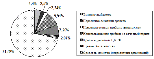 Рис. 2.1. Структура активов ОАО «Балтийский банк» на 01.01.2009г. в % Анализ и оценка активных операций является наиболее важной стадией анализа деятельности коммерческого банка, так как позволяет оценить, насколько эффективно банк использует свою ресурсную базу, а также в некоторой степени определить степень специализации банка. В структуре активов преобладают активы, приносящие доход банку. Их удельный вес в структуре активов на начало 2009 года составляет 73,39%. В структуре активов, приносящих доход, преобладает чистая ссудная задолженность, которая на начало 2009г. составляет 54,78%. Темп прироста чистой ссудной задолженности за данный период составил 13,2%. Данное изменение произошло вследствие расширения клиентской базы и появления у Банка новых крупных клиентов-заемщиков. В целом, тенденция к увеличению работающих активов заслуживает положительной оценки, тем не менее, одновременно следует учитывать возможное увеличение рисков банка, связанных с вложениями в активы, приносящие доход (прежде всего, риск потери ликвидности, кредитный риск, валютный риск, рыночный риск и др.). Состав ценных бумаг в портфеле банка может включать в себя весь перечень ценных бумаг, обращающихся на рынке, - это акции, облигации, векселя и иные ценные бумаги. Банк активно проводил операции РЕПО на финансовом рынке с различными инструментами, как в рублях, так и иностранной валюте. В структуре активов, не приносящих доход, на 01.01.2009г. преобладают денежные средства, которые составили 9,01%. Банком в целях сбалансированности активов был существенно увеличен объем денежных средств на 25,7% и средств, размещенных в кредитных организациях на 1811,5%. При оценке абсолютного изменения величины активов Банка за период было выявлено его увеличение в 1,2 раза (с 43 726 млн. руб. до 55 085 млн. руб.), что может свидетельствовать о наращивании Банком объемов активных операций; о расширении спектра обслуживаемых клиентов; о росте банковской прибыли, а, следовательно, и эффективности банковской деятельности в целом. Данное изменение может также свидетельствовать об отрицательных тенденциях: об увеличении размера низкодоходных активов и активов, не приносящих доход (касса, корсчета и т.п.); о росте дебиторской задолженности банка и др. Для анализа структуры и динамики пассивов банка обратимся к табл. 2.2, составленной на основе аналитического баланса ОАО «Балтийский банк». Таблица 2.2 Структура и динамика пассивов КБ ОАО «Балтийский банк»