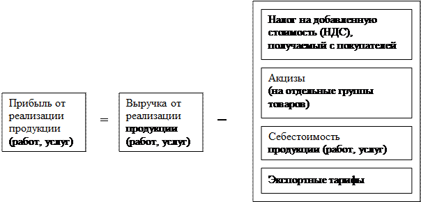 Рис. 1.1. Связь между себестоимостью, валовым доходом и прибылью предприятия Конечный финансовый результат (валовая прибыль или валовой убыток) слагается из финансового результата от реализации продукции (работ, услуг), основных фондов и иного имущества предприятия и доходов от внереализационных операций, уменьшенных на сумму расходов по этим операциям. Прибыль (убыток) от реализации продукции (работ, услуг) определяется как разница между выручкой от реализации в действующих ценах без НДС и акцизов и затратами на производство и реализацию продукции. Предприятия, осуществляющие экспортную деятельность, при начислении прибыли из выручки от реализации продукции исключают экспортные тарифы (рис. 1.2).