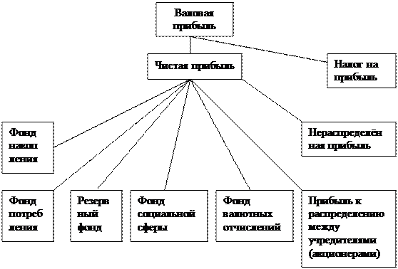 Рис. 1.2. Прибыль от реализации продукции Распределение прибыли предприятия в самом общем виде представлено на рис. 1.3. Существует и более простой вариант использования чистой прибыли, когда не образуются плановые фонды накопления и потребления. Однако на крупных предприятиях их наличие помогает рационально распределять финансовые средства и осуществлять контроль за их эффективным использованием. Фонд накопления, образуемый за счет прибыли, используется на приобретение и строительство основных фондов производственного и непроизводственного назначения и осуществление других капитальных вложений, которые не носят безвозвратный характер. Часть средств фонда накопления, направленная на долгосрочные инвестиции, не расходуется безвозвратно. Вместо потраченных денежных средств, которые числились в активе баланса на расчетном счете, появляется эквивалентная стоимость другого имущества, созданного на эти средства и также отраженного в активе баланса, но подругой статье (например, «Основные средства», «Нематериальные активы» и др.).