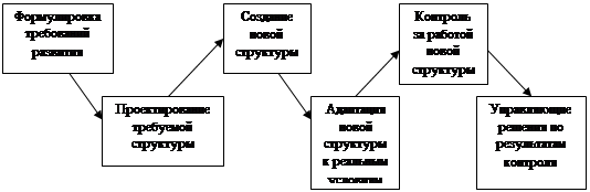 Развитие фирмы является постоянным и непрерывным процессом. В общем виде процесс управления развитием фирмы представлено на рис. 1. в виде последовательности определенных шагов. 1. Формулировка требований развития. Исходя из имеющихся ресурсов и состояния рынка, определяется приоритетное направление развития и формулируются требования к новой структуре (рентабельность, надежность, предполагаемое время ее существования) или требования по реструктуризации старой.