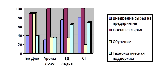 Рисунок 10 - Стратегические группы прямых конкурентов Специфика отрасли пищевых добавок состоит в том, что, чет выше качество предоставляемого товара, тем выше его стоимость. К группе "ценового лидерства" относятся компании по поставки сырья, прибыль которых варьируется от 11 до 14% от предлагаемой ими цены. К группе "дифференцирования" относятся компании, предоставляющие различный спектр услуг: - поставка сырья; - мониторинг рынка; - обучение; - технологическая поддержка; - внедрение сырья на предприятие. Перечень товаров, предоставляемых компаниями группы "дифференцирования" представлен на рис. 11. Наиболее востребованы услуги по поставки сырья, внедрение на производство, затем обучение. Технологическая поддержка тоже важно, но не все компании имеют у себя в штате специалиста конкретной области.