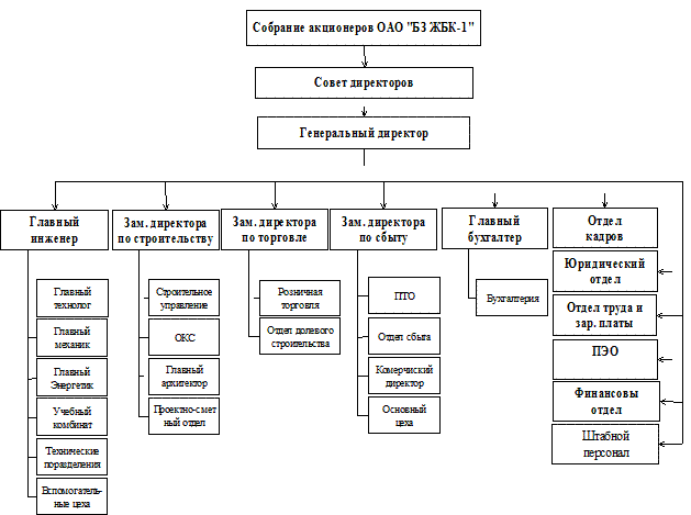 Рисунок 1 – Организационная структура «ЖБК-1» Высшим органом управления Обществом является общее собрание акционеров. В промежутках между общими собраниями высшим органом управления Обществом является совет директоров Общества, в компетенцию которого входит решение вопросов общего руководства деятельностью Общества, за исключением вопросов, отнесенных к исключительной компетенции общего собрания акционеров. Исполнительным органов Общества является генеральный директор. Генеральный директор назначается общим собранием акционеров. Он осуществляет оперативное руководство текущей деятельностью предприятия. Все цеха и службы завода оснащены современной компьютерной техникой, которая связана в единую локальную сеть. Специалистами отдела информационных технологий разработан программный комплекс для автоматизации производственных задач. С начала 1998 года завод имеет выход в глобальную сеть INTERNET и представлен там своей страницей. Завод ЖБК-1 имеет следующие производственные подразделения (рисунок 2).