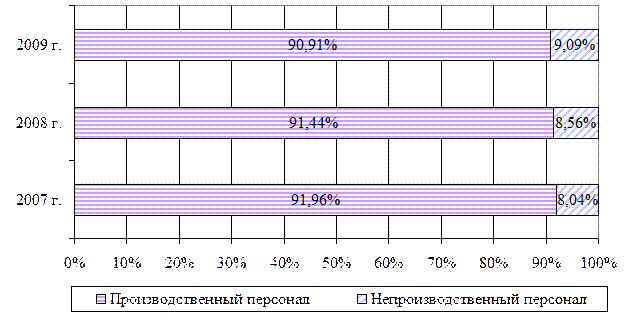 Анализ данных таблицы 1 позволяет говорить об общем увеличении численности персонала «ЖБК-1» в 2009 г. по равнению с 2007 г. на 195 чел. или на 7,25%. Производственный персонал предприятия в рассматриваемом периоде увеличился на 321 чел. или на 14,02%. Непроизводственный персонал организации в 2007 г. составлял 200 чел., в 2008 г. – 229 чел., в 2009 гг. – 258 чел., т.е. увеличение произошло на 58 чел. Наибольший удельный вес в структуре персонала предприятия в 2007 г. составляли производственные рабочие – 91,96%, доля служащих в структуре ППП была 13,59%. В 2009 г. в структуре персонала предприятия произошло уменьшение доли промышленно-производственного персонала до 90,91%. Необходимо отметить, что доля производственных рабочих увеличилась до 85,45%, а доля служащих увеличилась до 16,36%. Представим на рисунке 3 структуру персонала «ЖБК-1».