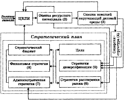 Открытые акционерные общества Уже из обязательных юридических характеристик ОАО следует, что это, как правило, крупные хозяйственные организации с большим числом работников, серьезной финансовой и производственной базой. Они производят львиную долю ВНП и обеспечивают рабочие места для большей части работающих. Словом, они оказывают огромное влияние на экономику страны и, во-первых, тем самым, а во-вторых, будучи средоточием больших групп взаимодействующих людей, и непосредственно — на все общественные процессы. Поэтому ОАО это уже не просто хозяйственные единицы, не только агенты экономической жизни, но и в большой степени общественные организации, элементы социума. Если добавить к этому, что и по материальным источникам своего формирования — акции покупают и разнообразные организации, и так называемые физические лица, т.е. просто люди, живущие при этом на всем пространстве от Балтики до Владивостока (а уже и за рубежом) и работающие где угодно, — другими словами, что оперируют они изначально общественными, т.е. сложенными сообща разными собственниками, капиталами, отношение к ОАО как к универсальным экономико-социальным образованиям будет полностью оправданно. 1.3.Система стратегического планирования на предприятии Переход к рыночным отношениям определил необходимость разработки нового подхода при обосновании развития предприятия (фирмы), вызванного необходимостью учета конкуренции, влияющей на стабильность его работы, а также возросшей ответственностью администрации предприятия (фирмы) за результаты принимаемых решений в таких областях, как определение ассортиментной и номенклатурной специализации; выбор целей, направлений и средств обновления продукции и технического перевооружения производства; распределение ресурсов предприятия, включающих сырьевые, финансовые, инвестиционные, научно-технологические и прочие. В понятие «планирование» входит определение целей и путей их достижения. На Западе планирование деятельности предприятий осуществляется по таким важным направлениям, как сбыт, финансы, производство и закупки. При этом, конечно, все частные планы взаимосвязаны между собой. Сам процесс планирования проходит четыре этапа: - разработка общих целей; - определение конкретных, детализированных целей на заданный, сравнительно короткий период времени (2,5,10 лет); - определение путей и средств их достижения; - контроль за достижением поставленных целей путем сопоставления плановых показателей с фактическими. В основе нового подхода лежит отказ от принципа, определяющего, что успех фирмы лежит только в рациональной организации производства продукции, в снижении издержек за счет выявления внутрипроизводственных резервов, в повышении производительности труда и в эффективном использовании всех видов ресурсов, т.е. отказ от принципа рассмотрения предприятия как закрытой системы, цели и задачи которой считаются заданными и остаются достаточно стабильными в течение длительного периода времени. Особенность нового подхода заключается в том, что фирма (предприятие) рассматривается как «открытая» система, главные предпосылки деятельности которой находятся не внутри, а вне этой системы, т.е. эффективность функционирования фирмы (предприятия) связывается с тем, насколько удачно она может приспосабливатьс