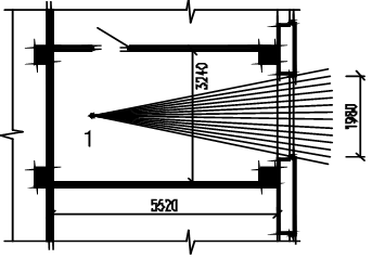 где εб – геометрический КЕО в расчётной точке при боковом освещении, учитывающий прямой свет неба, определяемый по формуле: εб = (n1 ∙ n2 ) ∙ 0,01, где n1 = 13 – число лучей проходящих через оконный проём (см рис. 5.4.1.1 ); n2 = 14 – число лучей проходящих через оконный проём (см рис. 5.4.1.1); εб = (13 ∙ 14) ∙ 0,01 = 1,82 ; q – коэффициент, учитывающий неравномерную яркость облачного неба МКО, q = 0,72; εзд – геометрическое КЕО а расчётной точке при боковом освещении, учитывающий свет, отражённый от противостоящих зданий, εзд = 0; R – коэффициент, учитывающий относительную яркость противостоящего здания; r1 – коэффициент, учитывающий повышение КЕО при боковом освещении благодаря свету, отражённому от поверхностей помещения и подстилающего слоя, прилегающего к зданию, r1 = 2,4; τ0 – общий коэффициент светопропускания определяемый по формуле: τ0 = τ1 ∙ τ2 ∙ τ3 ∙ τ4 ∙ τ5 , где τ1 – коэффициент светопропускания материала, определяемый, τ1 = 0,8 – для стеклопакета; τ2 – коэффициент, учитывающий потери света в переплётах светопроёма, τ2 = 0,8 – для одинарных переплётов; τ3 – коэффициент, учитывающий потери света в несущих конструкциях, τ3 = 1 – при боковом освещении; τ4 – коэффициент, учитывающий потери света в защитной сетке, устанавливаемой под фонарями, τ4 = 1; τ5 – коэффициент, учитывающий потери света в защитной сетке, устанавливаемой под фонарями, τ5 = 1; τ0 = 0,8 ∙ 0,8 ∙ 1 ∙ 1 ∙ 1 = 064; Кз – коэффициент запаса, Кз = 1,2.