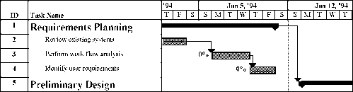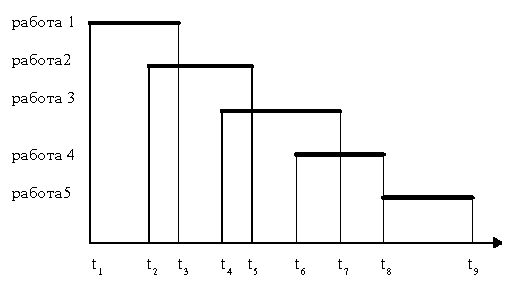 | ИСПОЛЬЗОВАНИЕ ПРОГРАММНОГО ОБЕСПЕЧЕНИЯ КАК ФАКТОР ПОВЫШЕНИЯ КАЧЕСТВА УПРАВЛЕНИЯ ПРОЕКТАМИ. 1. Программные методы и средства планирования и управления проектами Разработка современных систем сегодня - это многоэтапный процесс со специфическими техническими и организационными мероприятиями. Усложняется технология производства, увеличиваются объемы и разнообразятся информационные потоки, циркулирующие в обществе, ожесточаются требования к безопасности функционирования систем, их качеству и т.д. Своеобразным ответом на это является утверждение концепции Проекта в области разработки систем различного назначения. В практической деятельности и литературе под проектом понимается совокупность действий (мероприятий), направленных на достижение цели создания сложной системы с заданными характеристиками качества в ограниченные сроки и на ограниченном множестве ресурсов. Процессом достижения некоторой конкретной цели необходимо управлять, потому что результат и, соответственно, успех не может прийти самопроизвольно. Управление проектом - это особый вид деятельности, включающий планирование, контроль за выполнением работ и коррекцию плана путем применения современных методов управления. Очевидно, что базой эффективного управления проектом является план, в котором: -действия (мероприятия, работы) упорядочены по результатам и срокам их достижения; -достигнут компромисс между характеристиками системы и ресурсами. Из-за большого объема планируемых действий, сложности методов распределения и оптимизации плана проводить качественное планирование, осуществлять эффективный контроль и оперативную коррекцию плана без использования специальных программных средств невозможно. В основе используемых программных средств лежит технология сетевого планирования и управления, основные положения которой были разработаны в 70-х годах. Технологию сетевого планирования и управления (СПУ) составляют следующие методы: метод диаграмм Гантта и сетевые методы планирования. Рис. 1. Диаграмма Гантта