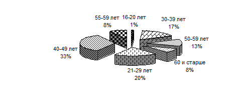 Рисунок 2.1 - Структура численности персонала ООО «Финист – Мыловар» по возрасту Из рисунка 2.1 видно, что на предприятии работают в основном сотрудники 40-49 лет, также достаточное количество сотрудников возрасте 21-29лет. На рисунке 2.2 представлена структура численности работающих, исходя из стажа.
