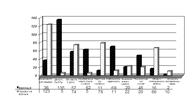 В качестве материальной мотивации в ООО «Финист-Мыловар» используется следующее. Сдельщикам при выполнении 100 % выработки к заработной плате начисляется 40% премии от общего заработка. Оплата труда работников ООО «Финист - Мыловар» осуществляется из фонда заработной платы. Системами оплаты труда рабочих предприятия являются повременно-премиальная и сдельная. Труд руководящих работников и специалистов фирмы оплачивается по повременно-премиальной системе. Каждому конкретному работнику размер оклада определяется администрацией фирмы в соответствии со штатным расписанием и не может быть ниже установленного федеральным законом минимального размера оплаты труда. Администрация ООО «Финист - Мыловар» вправе вводить новые прогрессивные системы оплаты труда для отдельных категорий работников по согласованию с работниками. Работа в сверхурочное время и выходные дни оплачивается согласно ст. 152 и ст.153 ТК РФ, работа в ночное время оплачивается согласно Ст. 154 ТК РФ, в повышенном размере 40% Время внутрисменного простоя не по вине работодателя, оплачивается в размере не менее двух третей средней заработной платы работника. Оплата труда работников производится за конечные результаты их труда. Производится доплата, за вредные и тяжелые условия труда. Инженерно-технический персонал все с высшем образованием. Предприятие централизованно проводит повышение квалификации, работники ООО «Финист – Мыловар принимают участие в семинарах. На предприятии следят за соблюдением работников правил техники безопасности, проводят медицинские осмотры работников за счет предприятия. Все сотрудники застрахованы в страховой компании «АСКО». На ООО «Финист - Мыловар» используются оптимальные формы и системы оплаты труда работников с минимальным количеством недостатков. В настоящее время на ООО «Финист - Мыловар» единственным средством стимулирования труда являются различные модификации премий, которые выплачиваются по итогам работы, за самые высокие показатели в труде по соответствующей профессии, к юбилею, за добросовестное выполнение трудовых обязанностей. В качестве средства стимулирования труда основных рабочих можно рекомендовать: дифференцировать размер премии за различное качество работы, выплачивать премии только при полном выполнении сменного задания, ввести доплаты за совмещение профессий, расширение круга работ и т.д. Проведем анализ мотивационной структуры работников. В особенности это касается управленческого состава, потому что именно для этой категории работников нередкой является ситуация, когда затраченные усилия по разработке новой компенсационной политики не только не усиливают мотивацию, но зачастую ослабляют ее. Новая или реформированная система компенсаций должна быть адекватна мотивационной структуре персонала. При анализе мотивационной сферы работникам ООО «Финист - Мыловар» из десяти предложенных факторов, влияющих на их работу, было предложено выбрать два, которые они считают наиболее важными, и два фактора, которые они считают наименее важными. Полученные результаты отражены на рисунке 2.3. Выделяются три фактора, которые работники ООО «Финист - Мыловар» считают наиболее важными для своей успешной работы: это деньги, льготы, стабильность, надежность, приобретение нового опыта и знаний; а также тр