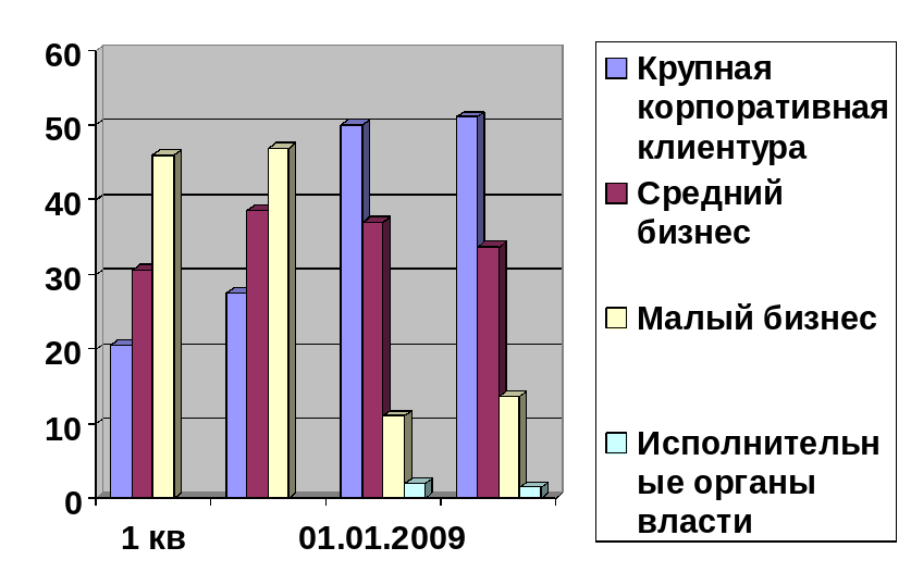 Структура корпоративного кредитного портфеля Рис 2 Особое внимание Банк уделяет работе с субъектами малого предпринимательства, количество которых составляет более 80% корпоративных клиентов и индивидуальных предпринимателей, обслуживающихся в Банке. Под влиянием кризисных явлений количество качественных заемщиков среди клиентов данного сегмента существенно сократилось. В условиях нестабильности и снижения потребительского спроса компании малого бизнеса предпочитали снижать уровень долговой нагрузки и погашать ранее взятые кредиты. В 2009 году в Сбербанке было создано специальное подразделение по работе с клиентами, чья годовая выручка не превышает 25 млн руб. и чей предельный объем кредитования по технологии «Кредитная фабрика» не превышает 1,5 млн руб., а подругим кредитным продуктам — 7 млн руб. Работа с данным сегментом была направлена на поддержку малого бизнеса в условиях сложной макроэкономической ситуации, расширение линейки кредитных и не кредитных продуктов и внедрение системы интернет-банкинга. Для субъектов малого предпринимательства в 2009 году представлены кредитные продукты «Бизнес-авто» и «Коммерческая недвижимость», запущены пилотные проекты «Экспресс-лизинг» и «Микро кредит субъектам малого бизнеса» с ускоренной процедурой рассмотрения кредитных заявок. Разработан проект офиса нового формата, ориентированного на работу с малым бизнесом. Начато консультирование компаний в режиме реального времени на интернет-портале www. opora-credit.ru и в круглосуточном центре телефонного обслуживания. Кроме того, в ряде подразделений г. Москвы и г. Самары стар-товал пилотный проект системы интернет-банкинга для юри- дических лици индивидуальных предпринимателей «Сбербанк Бизнес ОнЛ@йн». Продолжилось активное сотрудничество Банка с администрациями республик, краев и областей Российской Федерации в части финансирования региональных программ, направленных на развитие регионов и повышение их инвестиционной привлекательности, стабилизацию социального климата. По состоянию на 31 декабря 2009 года остаток ссудной задолженности государственных и муниципальных учреждений составил 94 млрд руб., увеличившись за год в 1,6 раза. Основной вид услуг, предоставляемых банком корпоративным клиентам, — услуги расчетно-кассового обслуживания. Комиссионные доходы Группы Сбербанка за расчетно-кассовое обслуживание юридических лиц по итогам года составили 36,9 млрд руб., или 35% всех комиссионных доходов Группы. В 2009 году возрос интерес крупнейших, крупных и средних компаний-холдингов к комплексным продуктам на базе систем дистанционного обслуживания, называемых «Корпоративное казначейство». Эта услуга позволяет холдингам контролировать операции по своим счетам, получать информационные сервисы (выписки и отчеты), осуществлять корпоративное бюджетирование и интеграцию с корпоративными учетными системами холдинга. В 2009 году стартовали проекты по созданию комплексных продуктов управления финансовыми потоками холдингов и контроля платежей на соответствие бюджету. Спад во внешнеэкономической деятельности клиентов, связанный в первую очередь с кризисными явлениями в мировой экономике, обусловил сокращение комиссионных доходов по документарным операциям на 1,7% — до 0,6 млрд руб. Объем операций клиентов по контрактам, связан