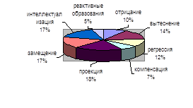 Рисунок 2. Процентное соотнеошение МПЗ, в большей или меньшей степени используемых испытуемыми. Самым преобладающим механизмом защиты в данной группе является «реактивные образования», встретившиеся у 9 из 14 опрошенных. Данный МПЗ был выявлен только у женщин. Такой результат скорее всего был получен в связи с тем, что женщинам чаще приходится скрывать свои истинные желания, так как, несмотря на равноправие и эмансипацию (женщины всё чаще выполняют работу мужчин, удачно ведут бизнес, проявляют острый ум и четкую логику, от женщин ждут активности в сексуальной жизни и т.д.), в обществе до сих пор негласно остается отношение к женщине как к существу второго сорта, призвание которого только «ходить в церковь, стоять на кухне и рожать детей». Женщины не знают, кто они, женщины или мужчины, они не знают, что является нормой, а что нет, их нереализованные желания и возможности вступают в конфликт с запретами и предрассудками, что и порождает данный МПЗ. На втором месте выступили «отрицание», «вытеснение» и «интеллектуализация», набравшие по 7 баллов. Примечательно, что «отрицание» выявилось у 5 женщин и 2 мужчин (у третьего мужчины, при других обстоятельствах, его пограничные показатели (70%) возможно также могут повыситься вследствие участившегося использования данной защиты). «Вытеснение» также было выявлено у двух мужчин и 5 женщин. В категории «интеллектуализация» проявил себя только один мужчина и 6 женщин. Интересны сочетания МПЗ у мужчин. Один испытуемый активно использует только одну защиту - «отрицание» (99%). Действительно, в процессе общения в тренинговой группе было явно видно, как те аспекты внешней реальности, которые, очевидны для окружающих, тем не менее не принимаются, не признаются этим молодым человеком. Иными словами, информация, которая тревожит и может привести к конфликту, не воспринимается. Имеется в виду конфликт, возникающий при проявлении мотивов, противоречащих основным установкам личности или информация, которая угрожает ее самосохранению, самоуважению, или социальному престижу. Как только защита ослабевала, молодой человек становился агрессивным, обвиняя всех в том, что его не понимают, желают ему зла, позже замыкался и переводил агрессию на самого себя. Было однажды замечено, что такое поведение привело этого молодого человека к непроизвольным подергиваниям головы и плеча. На наш взгляд, такая «психологическая слепота» может в дальнейшем привести к печальным последствиям. Второй молодой человек использует наряду с «отрицанием» (99%) «вытеснение» (71%) и «интеллектуализацию» (95%). Видимо, информация, поступающая извне, обрабатывается на начальном этапе, при этом небольшая часть информации просто вытесняется и забывается, оставшаяся информация либо отрицается, либо рационализируется при помощи логических установок и манипуляций, что пресекает переживания, вызванные неприятной или субъективно неприемлемой ситуацией. Удивительно, что в категории «интеллектуализация» максимум процентов получил только 1 мужчина против 6 женщин, причём у четырёх из них показатели более 90%. Опираясь на эти данные можно было бы поспорить с бытующим мнением, что женщины думают эмоциями, а мужчины умом. Испытуемый – будущий юрист, и такой «набор» МПЗ для него благоприятен, так как он поможет сохранить душевные силы, и предотврати