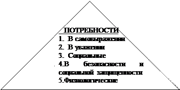 Рис. 2. Пирамида потребностей по А. Маслоу Смысл такого иерархического построения заключается в том, что приоритетны для человека потребности более низких уровней и это сказывается на его мотивации. Другими словами, в поведении человека более определяющим является удовлетворение потребностей сначала низких уровней, а затем, по мере удовлетворения этих потребностей, становятся стимулирующим фактором и потребности более высоких уровней. Самая высокая потребность – потребность самовыражения и роста человека как личности – никогда не может быть удовлетворена полностью, поэтому процесс мотивации человека через потребности бесконечен. Долг руководителя заключается в том, чтобы тщательно наблюдать за своими подчиненными, своевременно выяснять, какие активные потребности движут каждым из них, и принимать решения по их реализации с целью повышения эффективности работы сотрудников.[5] Теория потребностей Дэвида Мак Клелланда. С развитием экономических отношений и совершенствованием управления значительная роль в теории мотивации отводится потребностям более высоких уровней. Представителем этой теории является Дэвид Мак-Клелланд. Согласно его утверждению структура потребностей высшего уровня сводится к трем факторам: стремлению к успеху, стремлению к власти, к признанию. При таком утверждении успех расценивается не как похвала или признание со стороны коллег, а как личные достижения в результате активной деятельности, как готовность участвовать в принятии сложных решений и нести за них персональную ответственность. Стремление к власти должно не только говорить о честолюбии, но и показывать умение человека успешно работать на разных уровнях управления в организациях, а стремление к признанию - его способность быть неформальным лидером, иметь свое собственное мнение и уметь убеждать окружающих в его правильности. Согласно теории Мак-Клелланда, люди, стремящиеся к власти, должны удовлетворить эту свою потребность и могут это сделать при занятии определенных должностей в организации. Управлять такими потребностями можно, подготавливая работников к переходу по иерархии на новые должности с помощью их аттестации, направления на курсы повышения квалификации. Такие люди имеют широкий круг общения и стремятся его расширить. Их руководители должны способствовать этому[6] . Двухфакторная теория Фредерика Герцберга Во второй половине 50-х годов ХХ века Фредерик Герцберг с сотрудниками разработал еще одну модель мотивации, основанную на потребностях. Он разработал модель мотивации, которая опирается на две большие категории, которые он назвал «гигиеническими факторами» и «мотивацией». «Мотивации»: достижения (успех), признание и одобрение результата, работа сама по себе, высокая степень ответственности, продвижение по карьерной лестнице (творческий и деловой рост). «Гигиенические факторы»: политика компании и администрации, инспекции и непосредственный контроль над работой, заработная плата, межличностные отношения, условия работы. Гигиенические факторы связаны с самовыражением личности, ее внутренними потребностями, а также с окружающей средой, в которой осуществляется сама работа. Они соответствуют физиологическим потребностям, потребности в безопасности и уверенности в будущем. Вторая группа факторов мотив
