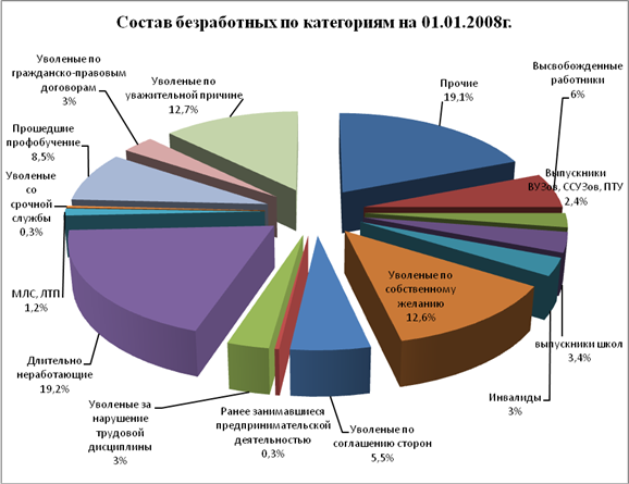 Рис. 3.1. – Состав безработных по категориям на 01.01.2008г. На 01.01.2008г. на учете в органах государственной службы занятости состояло 44,1 тыс. безработных (84,8% к уровню 2006г.), из них 54% получали пособие по безработице. Средний размер пособий за четвертый квартал 2007 года составил 45,4 тыс. руб. на одного безработного. По данным Министерства статистики и анализа Республики Беларусь численность населения, занятого в экономике в декабре 2007 года составила 4438,1 тыс.человек. За январь-декабрь 2007 года прием работников восполнил их выбытие на 101,9 процента, принято работников на 16,3 тысяч больше, чем уволено. Оборот рабочей силы составил 1773,0 тысячи человек или 50,1% от среднесписочной численности работающих (в аналогичном периоде 2006 г. - 50,0 процент). В связи с высвобождением уволено 11,0 тысяч человек, что составило 84,0 процента к уровню 2006 года. Сократились масштабы вынужденной неполной занятости и составили 122,0 тысячи человек или 76,8 процента к соответствующему периоду 2006 года. Численность работавших в режиме неполного рабочего времени сократилась на 21,7%, численность находившихся в отпусках по инициативе нанимателя – на 25,2%. [10, с.28] В 2007 году увеличилось число количество граждан, обратившихся в органы по труду, занятости и социальной защите за содействием в трудоустройстве на постоянную работу как в целом по республике, так и по областям. За 2007 год в органы государственной службы занятости обратилось за содействием в трудоустройстве 327,8 тысяч человек (106 процентов к уровню 2006 года), из которых 200,5 тысяч в соответствии с законодательством признаны безработными. Включая граждан, состоявших на учете на начало года, в трудоустройстве нуждалось 396,2 тысячи человек, в том числе 252,5 тысячи безработных. С начала года трудоустроено 201,4 тысячи человек (111,9% к заданию Программы), в том числе 130,1 тысячи безработных (94,3% к заданию Программы). Направлено на профессиональную подготовку, переподготовку и повышение квалификации 23,8 тысячи безработных (90,2% к заданию Программы). Приняли участие в оплачиваемых общественных работах 101,1 тысячи человек (104,0% к заданию Программы), в том числе 56,0 тысячи безработных (84,8% к заданию). Переселено на новое место жительства и работы, с их согласия, 332 семьи безработных (108,9% к заданию) с оказанием им финансовой поддержки из средств Фонда социальной защиты населения. Увеличился спрос на рабочую силу: на 0.01.2008г. в органы государственной службы занятости поступили сведения о наличии 50,8 тыс. вакансий, что составило 113,4% к уровню 2006 года. Если в 2006 году предложение рабочей силы превышало спрос в 1,2, то на начало 2008 года число вакансий превысило численность безработных в 1,2 раза. Вместе с тем, по-прежнему сохраняется структурный и территориальный дисбаланс спроса и предложения рабочей силы. Рынок труда по-прежнему ориентирован на рабочие профессии, которые составили 76,4% от общего количества заявленных нанимателями вакансий. Наиболее востребованными на рынке труда являются рабочие строительных профессий (каменщики, кровельщики, монтажники, штукатуры и т.д.), а также инженеры-строители. Большое количество вакансий заявляет промышленность, преимущественно на рабочие профессии (токари, фрезеровщики, электромонтеры, электромонтажники, наладчики оборудования и т.д.). Высоким спросом пользуются водители автомобилей, машинисты бульдозеров, экскаваторов, тр