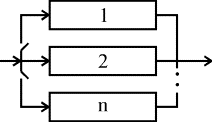 Рис. 2.16. Блок-схема системы с параллельным соединением элементов Условие работоспособности устройства можно сформулировать следующим образом: устройство работоспособно, если работоспособен элемент 1 или элемент 2, или элемент 3, или элементы 1 и 2, 1; и 3, 2; и 3, 1; и 2; и 3. Вероятность безотказного состояния устройства, состоящего из n параллельно соединённых элементов определяется по теореме сложения вероятностей совместных случайных событий как