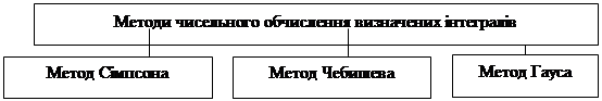 Рис. 1.1 Класифікація методів чисельного обчислення визначених інтегралів Метод Сімпсона – частинний випадок метода Ньютона-Котеса при n=2. Цей метод досить точний навіть для многочленів третього степеня. Ця особливість методу пояснює його переважне застосування на ЕОМ. Метод Чебишева – чисельний метод обчислення визначених інтегралів, який характеризується великою точністю обчислень для поліномів степеня n. Метод Гауса - чисельний метод обчислення визначених інтегралів, який базується на інтерполяції поліномом Лагранжа, але абсциси вибираються із умови забезпечення мінімума похибки інтерполяції. Цей метод забезпечую підвищену точність. 1.3 Опис методів дослідження еліптичного інтегралу першого порядку на ЕОМ Метод Сімпсона реалізується наступною формулою: