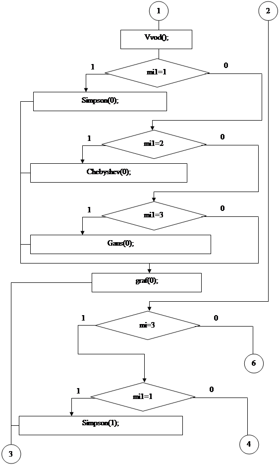 2.2 Аналіз задач, які вирішуються при дослідженні еліптичного інтегралу першого порядку на ЕОМ Дана програма дозволяє чисельно обчислювати значення елiптичного iнтегралу за допомогою чисельних методів Сімпсона, Чебишева та Гауса. 2.3 Описовий алгоритм основної програми 1. Виведення на екран строки меню та строки підказки. 2. При виборі в підменю “Про програму” пункту ”Про автора” вивести вікно з інформацією про автора програми. 3. Перейти до пункту 1. 4. При виборі в підменю “Про програму” пункту ”Завдання” вивести вікно з інформацією про завдання курсової роботи. 5. Перейти до пункту 1. 6. При виборі в підменю “Моделювання” пункту ”Сімпсон” вивести діалогове вікно для введення значення параметра К. 7. Знайти значення визначеного інтегралу за методом Сімсона. 8. Вивести на екран таблицю значень інтегралів. 9. Очікувати натиснення будь-якої клавіші. 10. Перейти до пункту 1. 11. При виборі в підменю “Моделювання” пункту ”Чебишев” вивести діалогове вікно для введення значення параметра К. 12. Знайти значення визначеного інтегралу за методом Чебишева. 13. Вивести на екран таблицю значень інтегралів. 14. Очікувати натиснення будь-якої клавіші. 15. Перейти до пункту 1. 16. При виборі в підменю “Моделювання” пункту ”Гаус” вивести діалогове вікно для введення значення параметра К. 17. Знайти значення визначеного інтегралу за методом Гауса. 18. Вивести на екран таблицю значень інтегралів. 19. Очікувати натиснення будь-якої клавіші. 20. Перейти до пункту 1. 21. При виборі в підменю “Тестування” пункту ”Тест1” знайти значення визначеного інтегралу за методом Сімсона. 22. Вивести на екран таблицю значень інтегралів, а також тестове значення інтегралу, абсолютну та відносну похибку. 23. Очікувати натиснення будь-якої клавіші. 24. Перейти до пункту 1. 25. При виборі в підменю “Тестування” пункту ”Тест2” знайти значення визначеного інтегралу за методом Чебишева. 26. Вивести на екран таблицю значень інтегралів, а також тестове значення інтегралу, абсолютну та відносну похибку. 27. Очікувати натиснення будь-якої клавіші. 28. Перейти до пункту 1. 29. При виборі в підменю “Тестування” пункту ”Тест3” знайти значення визначеного інтегралу за методом Гауса. 30. Вивести на екран таблицю значень інтегралів, а також тестове значення інтегралу, абсолютну та відносну похибку. 31. Очікувати натиснення будь-якої клавіші. 32. Перейти до пункту 1. 33. При виборі в підменю “Виведення результатів” пункту ”Читати файл” підпункту “На екран” вивести із масиву на екран таблицю інтегралів. 34. Очікувати натиснення будь-якої клавіші. 35. Перейти до пункту 1. 36. При виборі в підменю “Виведення результатів” пункту ”Читати файл” підпункту “Друк” вивести із масиву на друк таблицю інтегралів. 37. Очікувати натиснення будь-якої клавіші. 38. Перейти до пункту 1. 39. При виборі в підменю “Вихід” вийти із програми. 2.4 Схема алгоритму головної програми
