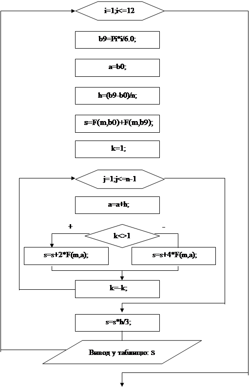 2.5 Опис основних функцій моделювання Основними функціями при моделюванні заданої системи є: 1) Simpson(int m) – функція чисельного обчислення значення визначеного iнтегралу методом Сімпсона; 2) Chebyshev(int m) – функція чисельного обчислення значення визначеного iнтегралу методом Чебишева; 3) Gaus(int m1) – функція чисельного обчислення значення визначеного iнтегралу методом Гауса; 4) F(float O) – підінтегральна функція. Функція Simpson 1) Назва функції – Simpson. 2) Заголовок функції - Simpson(int m). 3) Вхідні та вихідні дані. Таблиця 2.3 - Перелік вхідних даних