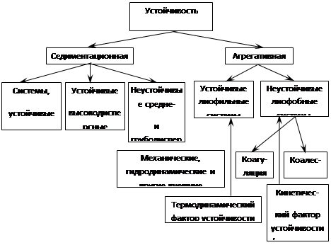 Устойчивость дисперсных систем – это возможность их нахождения в исходном состоянии неопределенно долгое время. Устойчивость дисперсных систем может быть: 1. К осаждению дисперсной фазы - характеризует способность дисперсной системы сохранять равновесное распределение фазы по объему дисперсионной среды или ее устойчивость к разделению фаз. Это свойство называется седиментационная (кинетическая) устойчивость. 2. К агрегации ее частиц. Агрегативная устойчивость – это способность дисперсной системы сохранять неизменной во времени степень дисперсности, т.е. размеры частиц и их индивидуальность. Она обусловлена способностью дисперсных систем образовывать агрегаты (т.е. укрупняться). По отношению к агрегации дисперсные системы могут быть устойчивыми кинетически и термодинамически . Термодинамически устойчивые системы образуются в результате самопроизвольного диспергирования одной из фаз, т.е. самопроизвольного образования гетерогенной свободнодисперсной системы. Дисперсные системы также делят на: · лиофильные, обладающие термодинамической устойчивостью; · лиофобные, которые термодинамически неустойчивы к агрегации, но могут быть устойчивы кинетически, т.е. обладать значительным временем жизни. Особенности этих двух видов устойчивости показаны на схеме: