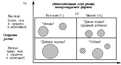Рис. 6. Матрица BCG для гипотетической фирмы «Дикая кошка». Быстрый рост рынка делает эти СБЕ привлекательными. Но их относительная доля на рынке низка и рождает вопрос, удастся ли реализовать потенциально высокую прибыль. Поэтому фирма должна решить, следует ли ей инвестировать капитал в СБЕ, расположенные в этом квадранте. BCG утверждает, что имеются две наилучшие возможности действий в этой ситуации: – агрессивная стратегия роста для реализации возможностей быстрого роста; – «раздевание» в случае, если стоимости усиления позиций на рынке при агрессивной стратегии роста перевесят потенциальные выгоды и финансовый риск. Следование стратегии быстрого роста всегда предпочтительнее, если СБЕ характеризуются эффектом снижения издержек производства за счет его масштаба. При этом увеличение контролируемой доли рынка позволяет занять позицию конкуренции по более низкой стоимости, далее опять увеличить контролируемую долю рынка. Таким образом, корпоративная стратегия предписывает для СБЕ, находящихся в этом квадранте бизнеса: «раздевать» наиболее слабые и не имеющие шансов выбиться в лидеры за счет масштабов производства СБЕ и инвестировать привлекательные СБЕ с целью превращения их в «звезды». «Звезды». Это, конечно, самая лучшая позиция для бизнеса. Но «звезды» обычно требуют больших инвестиций для поддержки экспансии продукции и увеличения производственных мощностей. Но они также могут генерировать свои собственные внутренние потоки инвестиций вследствие преимуществ низких издержек при больших масштабах производства. Те СБЕ в этой области, которые долго существуют и приближаются к зрелости, поддерживают сами себя, а юные СБЕ часто требуют существенных инвестиций. «Дойные коровы». Бизнес в этом секторе с относительно большой контролируемой частью рынка и при лидирующих позициях в отрасли обеспечивает достаточно притягательную прибыль, но вследствие слабого роста отрасли в целом нет необходимости реинвестировать капитал для поддержания позиции СБЕ на рынке, а потоки инвестиций целесообразно направить в другие секторы. Многие из сегодняшних «дойных коров» вчера были «звездами». Они должны «доиться» для выплаты дивидендов корпорацией и для финансирования новых предприятий: юных «звезд» и «диких кошек» с целью их превращения в «звезды». Слабые «дойные коровы» становятся кандидатами для «раздевания», если в отрасли, достигшей зрелости, создаются неблагоприятные конкурентные условия. «Собаки» – наименее привлекательный сектор вследствие не передовых позиций на рынке и малых прибылей по сравнению с лидерами, которые пользуются преимуществами масштаба производства. Таким образом, эти СБЕ, как правило, кандидаты к ликвидации. Для того, чтобы сделать заключение об эффективности портфеля СБЕ ООО «ЮТА», рассмотрим некоторые показатели финансово-хозяйственной деятельности в разрезе СБЕ (таблица 1). Таблица 1. Консолидированные показатели реализации основной продукции ООО «ЮТА» и его дочерних обществ, в ед. продукции