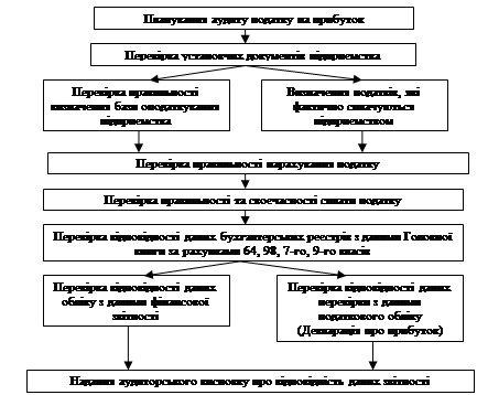 8. Перевірка правильності заповнення Декларації про прибуток підприємства. 9. Перевірка своєчасності подання податкової звітності до органів Державної податкової служби та своєчасність сплати податку на прибуток до бюджету. При виявленні під час проведення аудиту помилок у розрахунках витрат на сплату податку на прибуток необхідно надати відповідні рекомендації щодо виправлення таких помилок. Для цього на підприємстві: -складають бухгалтерську довідку із зазначенням причин допущеної помилки в тому періоді, в якому виявлено й виправлятиметься помилка; -розраховують й сплачують суму недоїмки з податку на прибуток та пеню за прострочення платежу; -повідомляють орган податкової служби за місцем реєстрації платника в письмовій формі про суму донарахованого податку на прибуток та розраховану суму пені за прострочення платежу. Складання бухгалтерської довідки є підставою для відображення господарських операцій на рахунках бухгалтерського та в системі податкового обліку для виправлення допущеної помилки із зазначенням причин. До бухгалтерської довідки необхідно додати розрахунки суми недоїмки з податку на прибуток та пені за прострочення платежу, повідомлення податкового органу про суму донарахованих податку на прибуток та пені за прострочення платежу потрібне для відображення даних за особовим рахунком підприємства. 10. За результатами виконаної роботи надання підприємству - клієнту аудиторського висновку щодо достовірності звітної інформації. 3.2 Методика проведення аудиту податкової звітності з податку на прибуток 3.2.1 Методика проведення аудиту нарахування і сплати податку на прибуток Нестабільність фінансового стану держави, високий рівень оподаткування і криза розрахунків негативно впливають на рівень бюджетного дефіциту. Непосильний податковий прес з боку держави на юридичних і фізичних осіб є стримуючим фактором розвитку виробництва, торгівлі і побуту, призводить до виникнення заборгованості перед державою, підприємствами і громадянами. Нині фінансові та інші органи по завжди сприяють ефективній перевірці формування і витрачання бюджетних коштів, тому попередній контроль і поточний аудит н умовах формування ринкового середовища і фінансової стабілізації мають зайняти основне місце в роботі фінансових, контрольно-ревізійних, митних органів та аудиторських фірм. Створена в Україні податкова служба покликана здійснювати жорсткий контроль за правильністю вирахування сум платежів і своєчасністю їх перерахування у доход державного бюджету. Отже, завдання аудитора — встановлення за всіма видами платежів у бюджет і позабюджетних платежів правильності обчислення суми платежів, своєчасності внесків (перерахувань) податків, з'ясування причин прострочення платежів. Основними джерелами інформації при цьому є: довідки і розрахунки за окремими видами платежів, виписки банку і прикладені до них документи про перерахування належних сум у бюджет, бухгалтерські записи по рахунку 64 "Розрахунки за податками й платежами", журнал № 3, відомості, машинограми. Перед початком проведення аудиту необхідно перевірити наявність прямих податків на підприємстві (податок на прибуток, прибутковий податок з громадян, податок на додану вартість). Під час аудиторської перевірки правильності нарахування і сплати ок