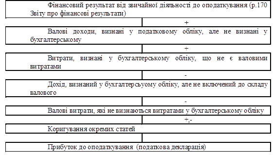 Алгоритм розрахунку має бути таким: -визначення складу постійних різниць; -визначення суми тимчасових різниць; -визначення розмірів відстрочених податкових активів та відстрочених податкових зобов’язань; -визначення різниці між відстроченими податковими активами та відстроченими податковими зобов’язаннями. При перевірці правильності розрахунку слід вдатися до таких дій: -визначити поточний податок на прибуток, отриманий за даними податкового обліку (множенням об’єкту оподаткування на ставку); -визначити обліковий податок на прибуток; -визначити різницю між податковим та обліковим податком; -визначити суму відстроченого податку (Різницю між податковим та обліковим податком - Постійні різниці*%). 7.4. Здійснення остаточної перевірки правильності ведення обліку розрахунків з бюджетом з податку на прибуток та відображення інформації у фінансовій звітності. 7.5. Перевірка правильності узгодження даних податкового та бухгалтерського обліку. Узгодження даних, тобто визначення прибутку до оподаткування повинне відбуватися таким чином: Рисунок 3