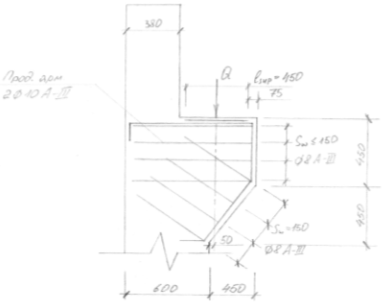 тогда Принимаем As ≥ µmin ∙ в ∙ ho , т.е. 2ф16 А-IIIcAs = 402 мм2 . П.2.2.2 Расчет подкрановой консоли крайней колонны 1. Q = Дмах + Nп.б. = 129,51 + 42,85 = 172,36 кН; 2. h = 800 мм; hk = 450 мм; в = 400 мм; е = 350 мм; Qm =50 мм; ho = 800 – 50 = 750 мм. Принимаем в консоли горизонтальные и наклонные двухветвенные хомуты в = 8 мм класса А-III с шагом Sw = 150 мм, тогда Asw = 2 ∙ 50,3 = 100,6 мм2 .