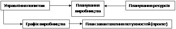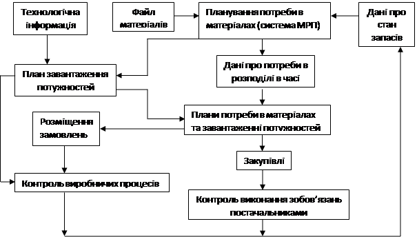 Мал. 3. Критерії оцінок при виборі логістичної системи 1-Ступінь надійності поставок; 2-мінімальна тривалість транспортування; 3-мінімальні транспортні витрати;4-гнучкість систем; 5-забезпечення зберігання вантажів та запобіганням можливим ушкодженням їх; 6- швидкість обробки рекламацій; 7- мінімальні витрати на пакування вантажів; 8-низькі транспортні витрати. 3. Логістичні системи в заготівлях Впровадження організаційних механізмів координації, що інтегрують зусилля функціональних ланок, які раніше виконували свої функції ізольовано, вимагає паралельного вдосконалення управлінських координуючих процедур. Система МРП (англ. materials requirements planning) — планування потреби в матеріалах — належить до систем «штовхаючого» типу. У них складають перелік матеріалів, необхідних для виробництва визначеної кількості готової продукції, відповідно до прогнозу ринкової кон'юнктури, після чого формують замовлення постачальники. Теоретично в системі «штовхаючого» типу обов'язковим є формування поточних та страхових запасів, кількість яких значно перевищує кількість відповідних запасів при роботі за «тягнучою» системою. Однак в умовах багатономенклатурного виробництва формування таких запасів виправдане. Система МРП (ще її називають МРП-1) досить поширена в США. В середині 80-х років її використовували або намагались використовувати більшість фірм з обсягом реалізації понад 15 млн дол. на рік. Ця система має широкий набір машинних програм, що забезпечують узгодження та оперативне регулювання постачальницьких, виробничих, збутових функцій фірми. Для здійснення цих функцій у МРП використовують дані плану виробництва (у спеціалізованій номенклатурі на визначений момент часу), файл матеріалів (формується на основі плану виробництва і включає специфіковані найменування необхідних матеріалів, їх кількість на одиницю готової продукції, класифікацію за рівнем), файл запасів (дані про матеріальні ресурси, необхідні для реалізації графіка виробництва, як про ті, що є, так і про замовлені, що не надійшли, про страхові запаси та ін.). Формалізація процесів прийняття рішень у системі МРП здійснюється за допомогою різних методів дослідження операцій. На основі математичних моделей, інформаційного та програмного забезпечення розраховують потреби в сировині та матеріалах; складають графік виробництва та видають на друк чи на дисплей з різною періодичністю вихідні форми. Отже, система МРП — це комп'ютеризований метод виявлення потреби в матеріалах на різних стадіях виробничого процесу. Рух матеріальних ресурсів розраховують у просторі й часі відповідно до потреб наступної виробничої стадії. Тому матеріал фактично постачається в момент, коли, за розрахунками, в ньому є потреба. Недолік системи в тому, що необхідні матеріали ніби «виштовхуються» працівниками попередніх етапів виробничого процесу до наступних стадій виробництва у необхідній кількості, в потрібний час, в потрібне місце незалежно від того, потрібні вони там у такій кількості чи ні в конкретний час. Проте, не зважаючи на цей недолік, як показує досвід, використання МРП дає змогу зменшити запаси, прискорити їх обертання, скоротити кількість випадків порушення строків поставок. У 80-ті роки в США та інших країнах дістала великого поширення система МРП-2, яку деякі американські фахівці
