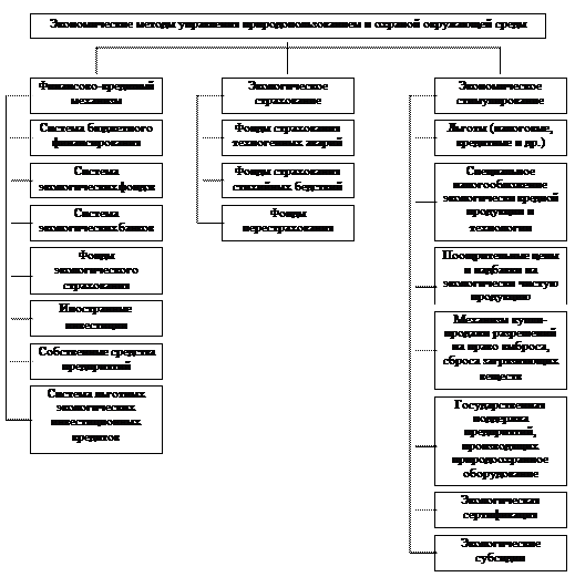 Рис. 1.1. Совокупность экономических методов управления в области природопользования. Примечание. Источник: [8, с.217]. Существует три типа экономического механизма природопользования. Первый тип – ограничивающий, или догоняющий. Это довольно мягкий в экологическом отношении механизм. Он ставит самые общие экологические рамки для экономического развития отраслей, практически не тормозя его. Данный тип экономического механизма направлен главным образом на ликвидацию негативных экологических последствий, слабо влияя при этом на темпы и масштабы развития. Второй тип можно охарактеризовать как жесткий, подавляющий. Этот механизм посредством жесткой налоговой, кредитной, штрафной политики практически подавляет развитие определенных отраслей и комплексов в области расширения их природного базиса, в целом способствуя экономии использования природных ресурсов. Такой механизм характерен для ряда природоэксплуатирующих комплексов в западных странах. Третий тип – стимулирующий. Он благоприятствует развитию экологосовместимых и природоохранных производств и видов деятельности. Такой механизм природопользования способствует увеличению производства на базе новых технологий, позволяет улучшить использование и охрану природных ресурсов. Экономический механизм природопользования реализуется посредством системы управления природопользованием. Управление природопользованием – это деятельность государства по организации рационального использования и воспроизводства природных ресурсов, охраны окружающей среды, а также по обеспечению режима законности в эколого-экономических отношениях. Механизм управления природопользованием объединяет методы, функции и организационные структуры (органы управления). Методы управления – это способы воздействия на поведение и деятельность управляемых объектов с целью обеспечения рационального природопользования и охраны окружающей среды. Применяются следующие основные методы управления: - административные (командно-распорядительные) – обеспечиваемые возможностью государственного принуждения; - экономические – создающие непосредственную материальную заинтересованность субъектов хозяйствования в выполнении необходимых экологических мероприятий, решений органов управления в сфере природопользования; - социально-психологические – методы морального стимулирования, которые реализуются посредством мер как поощрительного характера, так и воздействия на нарушителей (благодарности или выговоры, устные или в приказах администрации и т.п.). В странах с развитой рыночной экономикой и устоявшимися демократическими традициями широкое распространение получили так называемые информационные методы управлении, обеспечиваемые открытым доступом общества к информации экологического характера. Освещение в средствах массовой информации, открытых статистических сборниках и других изданиях сведений о характере воздействия на окружающую среду тех или иных субъектов хозяйствования формирует репутацию фирмы в глазах населения, служит ей рекламой или антирекламой. В условиях рыночной конкуренции открытая информация о хозяйственной деятельности природопользователей и ее экологических последствиях является мощным рычагом воздействия на управляемые объекты. Орхусская конв