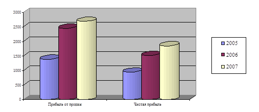 Из табл. 7 можно сделать вывод о том, что анализируемое предприятие на протяжении трех лет активно развивалось. В 2005 году чистая прибыль ООО «ПАКАРТ» составляла 940 тыс. руб., в 2006 г. - 1518 тыс. руб., а в 2007 году - 1854 тыс. руб. Выручка от проданной продукции и себестоимость проданной продукции также увеличились вполовину и к 2007 г и составили 68989 тыс. руб. и 66294 тыс. руб. соответственно. Вследствие этого повысилась валовая прибыль на 95%, в 2005 году она составляла 1380 тыс. руб., а в 2007 году стала равна 2695 тыс. руб., прибыль от продаж - на 95%, прибыль до налогообложения и текущий налог на прибыль - на 97%. Это явилось следствием расширения рынка сбыта, активного привлечения средств. Из чего следует, что у предприятия ООО «ПАКАРТ» достаточно стабильные темпы роста выручки и прибыли, его финансовое состояние оценивается, как более чем устойчивое. Общество способно функционировать и развиваться, сохранять равновесие своих активов и пассивов в изменяющейся внутренней и внешней среде. Отразим соотношение прироста прибыли от продаж и чистой прибыли за 2005-2007 гг. на рисунке 4.