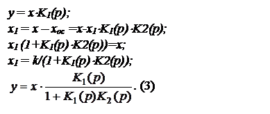 Параллельное-встречное соединение – это соединение, в котором выходная величина обратно подается на его вход через другое звено. Такое соединение называется соединением с обратной связью (рис. 3). Обратная связь – ОС может быть положительной(если знак входного сигнала и сигнала ОС совпадают) и отрицательной (если они противоположны по знаку).На практике широко используется отрицательная обратная связь (ООС) для устойчивой работы системы.