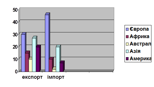 Одержує Україна верстати та обладнання, хімічні продукти, засоби обчислювальної техніки, одяг, взуття, побутову електроніку. Значно активізували торгівельні зв'язки з нами США, Канада, Японія та інші неєвропейські економічно розвинуті країни (мал. 4.1). У групі країн, що розвиваються, найбільше значення для України має Індія. Українські підприємства брали участь в поставках у цю країну комплектного обладнання для будівництва металургійних, енергетичних та машинобудівних об'єктів. Окрім того, здійснювались поставки сучасного озброєння. Україна одержує з Індії бавовняні тканини, одяг, чай, каву, фрукти, соки. В Малюнок 4.1 . Структура експорту та імпорту України з країнами далекого зарубіжжя Основними експортними товарами (таблиця 4.2) є: залізна та марганцева руди, прокат чорних металів, чавун, кам'яне вугілля, - кокс, кальцинована сода, азотні добрива, прокатне та ковальсько-пресове обладнання, обладнання для хімічної . промисловості, тепловози, екскаватори, літаки, енергетичне обладнання, цемент, віконне скло. У групі товарів народного споживання — цукор, м'ясо, соняшникова олія, борошно, а також телевізори, побутові холодильники, мотоцикли. Підприємства ВПК експортують зброю.[1] В імпорті переважають нафта, газ, руди кольорових металів, деревина, бавовна, одяг, взуття, калійні добрива, верстати та обладнання для легкої й харчової промисловості, свердловинні установки, засоби обчислювальної техніки, вантажівки, папір, целюлоза, риба, а також чимало кондитерських та плодоовочевих виробів, алкогольних напоїв. Таблиця 4. 2. Товарна структура зовнішньої торгівлі України в 1996 р. (в %)
