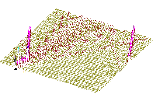 Численное интегрирование системы (2) ( рис. 1) показало, что образуются две уединенных волны, движущихся справа налево по цепи с постоянной скоростью. Первая волна имеет форму квазикинка, а вторая волна имеет форму квазибризера, причем скорость первой волны превосходит таковую для второй. Обе волны за счет “квазициклических” граничных условий, доходя до левого конца, появляются на правом конце без изменения своей формы. Квазикинк, проходя по цепи маятников, изменяет координату каждого маятника на угол На рис. 2 представлены результаты интегрирования системы (4) при тех же условиях. Из рисунка видно, что образуются те же две уединенных волны - квазикинк и квазибризер. Но принципиальное отличие от рассмотренного случая состоит в том, что квазикинк в самом начале движется с отрицательным ускорением, так что в результате его скорость оказывается меньше скорости квазибризера. Заметим, что исследования проводились на однородной поли-A-последовательности; так что изменение скорости квазикинка нельзя объяснить влиянием неоднородности цепочки. Этот эффект объясняется нелинейным взаимодействием между ее мономерами. Рис. 3 иллюстрирует результаты интегрирования системы (4) при тех же условиях за исключением того, что A =2. В данном случае реализуется только квазикинк и его отрицательное ускорение в начале движения таково, что в результате он движется в направлении, противоположном первоначальному. При интегрировании системы (2) в аналогичных условиях также образуется только квазикинк. Его скорость не меняется по сравнению со случаем рис. 1. Существенно, что при соответствующих условиях в системе типа ДНК или РНК могут возникнуть перевзбужденные ровибронные состояния. На квантовом языке это было бы адекватно перезаселению высоко лежащих квантовых уровней по сравнению с основным (реализации инверсной заселенности). В этом случае возникает заманчивая мысль, связанная с принципиальной возможностью создания биосолитонного лазера (БСЛ) на молекулах ДНК. Однако, в теории динамики биополимеров хорошо известно, что конформационные движения реализуются по механизму ограниченной диффузии ввиду сильного влияния диссипативных сил со стороны микроокружения. По этой причине решение проблемы создания БСЛ на ДНК представляется весьма проблематичным, по крайней мере, для подтверждения идеи необходимо выполнение условий: Существует также и другая сложность в отношении самосогласования биосолитонов и волны электромагнитного переизлучения. Напомним, что математическое моделирование в данном случае проводилось на монотонной поли-A ДНК и поэтому оставалось неясным влияет ли гетерогенная естественная последовательность ДНК на динамику солитонного возбуждения в молекуле. Чтобы проверить это, как и ранее, был взят С-район ДНК на 3’-конце вируса саркомы птиц в качестве полигона для запуска солитонов на разных участках полимера. На этот раз вычисляли производную от функции с тем, чтобы нагляднее показать движения солитонов. На рис.5,6 (см. ниже) хорошо видно, как при сдвиге области возбуждения солитонной волны от правой нижней части графика налево траектория волны претерпевает существенные изменения, т.е. “словесно-речевое” наполнение ДНК отображается в поведении солитона. Но главное здесь не только и не столько в этом. На этот раз характерн