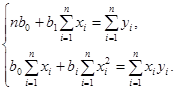 Аналіз зображеної множини точок дозволяє зробити висновок про наявність лінійного зв’язку між кількістю клієнтів банку та кредитовим оборотом, тобто для характеристики даної залежності варто обрати лінійну функцію. Нехай залежність між кредитовим оборотом та чисельністю клієнтів банку описується простою лінійною моделлю y=β0 +β1 x+u, де y- кредитовий оборот; х - чисельність клієнтів банку; u – стохастична складова, яка вводиться до моделі з метою урахувати наявність впливу факторів, які не входять до моделі, β 0 , β 1 – параметри моделі. Згідно з гіпотезою про лінійний зв’язок через кореляційне поле точок можна провести принаймні кілька прямих ліній, які різняться своїми параметрами b 0 таb 1 . Щоб певна пряма адекватно описувала фактичну залежність, необхідно обрати такий метод оцінювання параметрів моделі, щоб відхилення фактичних значень від розрахункових били мінімальними. У цьому разі мінімізації підлягає сума квадратів відхилень: Розрахункові значення кредитового обороту можна знайти, скориставшись такою моделлюпарної лінійної регресії: Щоб оцінити параметри моделі b 0 та b 1 методом 1МНК, запишемо систему нормальних рівнянь