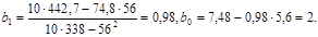 Маємо: Модель лінійної парної регресії має вигляд: у=0,98х+2 . Оскільки вільний член b 0 =2≠0 , то величина кредитового обороту не є строго пропорційною до кількості клієнтів банку. Кількісна оцінка параметра b 1 = 0,98показує, що граничне збільшення кредитового обороту при зростанні чисельності клієнтів банку на одного становить 0,98 млн. грн. Еластичність кредитового обороту щодо кількості клієнтів банку визначається коефіцієнтом еластичності Значення цього коефіцієнта слід тлумачити так: при збільшенні кількості клієнтів банку на 1% кредитовий оборот гранично зросте на 0,73 %. Параметри регресії у невеликих за обсягом сукупностях здатні до випадкових коливань. Тому здійснимо перевірку їх істотності або статистичної значимості за допомогою t –критерію Стьюдента: