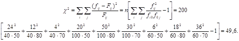 Проаналізувати комбінаційний розподіл робітників, оцінити щільність зв’язку між віком інвесторів та схильністю до ризику за допомогою коефіцієнта взаємної спряженості. Перевірити істотність зв’язку з імовірністю 0,95, зробити висновок. Розв’язання. Концентрація частот навколо діагоналі з верхнього лівого кута у правий нижній свідчить про наявність стохастичного зв’язку. Для оцінки щільності зв’язку обчислимо коефіцієнт спряженості Чупрова, тому що кількість груп за факторною ознакою – віком та результативною – тип інвестора щодо схильності до ризику однакова: mx