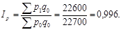 Індивідуальні індекси цін на кожний товар: Ціна товару А в квітні порівняно з березнем зменшилася на 7 %, тоді як ціна товару В зросла на 3 %. Загальний індекс товарообігу Загальний індекс цін на обидва товари в цілому за схемою індексів Пааше: В загальному ціни зменшилися на 0,6 %. Загальний індекс цін на обидва товари в цілому за схемою індексів Ласпейреса: В загальному ціни зменшилися на 0,4 %. Загальний індекс обсягу реалізованих товарів в цілому за схемою індексів Пааше: В загальному обсяг реалізації збільшився на 14,8 %. Загальний індекс обсягу реалізованих товарів в цілому за схемою індексів Ласпейреса: В загальному обсяг реалізації збільшився на 15,0 %. В даному прикладі індекси Ласпейреса мають дещо більше значення ніж індекси Пааше. Відомо, що Абсолютну зміну товарообігу в цілому та за рахунок факторів можна як різницю між чисельником та знаменником відповідного індексу.