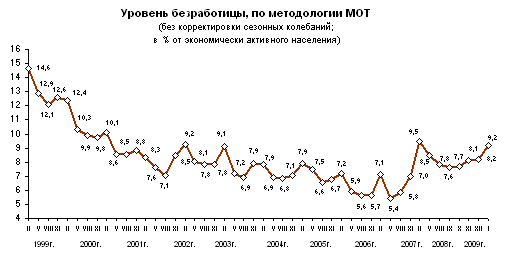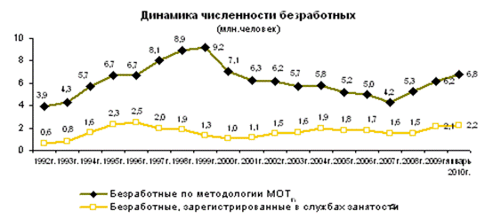 Рис.2 Динамика численности безработных за 1992-2009 года В 21 веке Россия столкнулась с нехваткой разведанных нефтегазовых месторождений, что повлекло за собой инвестиции и развитие геолого-разведовательных работ. Вместе с тем Россия потеряла значительное количество нефтеперегонных терминалов (в Прибалтике, на Украине). В срочном порядке началось строительство новых нефтегазопроводов и терминалов в Ленинградской области, в Новороссийске, а это еще новое высокооплачиваемые рабочие места. Научно технический прогресс требует новых высококвалифицированных кадров, что ведет к вовлечению дополнительных инвестиций в учебный процесс, то есть в ВУЗах открываются новые кафедры, открываются новые учебные заведения, курсы повышения квалификации и переквалификации рабочего персонала. Все это постепенно ведет к постепенному снижению безработицы. На январь 2010 года по данным служб занятости безработица составила 2,2 млн. человек. Все статистические данные представлены в таблице 1 и 2 (см. Приложение 1). За последние годы численность занятого населения сократилась на 9%. В настоящее время, по данным Госкомстата России, которые не отражают реального положения дел, более 5,9 млн. человек не имеют занятия, но активно его ищут; почти 1,5 млн. человек зарегистрированы в органах службы занятости в качестве безработных. В связи с изменением отраслевой структуры занятости (уменьшением числа работающих в отраслях обрабатывающей промышленности, особенно в машиностроении и легкой промышленности) обострились региональные проблемы занятости. В 47 субъектах Российской Федерации из 89 безработица превышает средний уровень по стране, в отдельных городах наблюдается массовая безработица. Интересна дифференциация регионов России по составу безработных. Первоначально основную массу безработных в России составляли женщины, лица с высшим и средним специальным образованием, лица предпенсионного возраста. Но затем в тех регионах, где уровень безработицы был выше среднего, стали расти доля мужчин, доля лиц с низким уровнем образования, доля молодежи. В России острая безработица наблюдается в регионах двух типов. Во-первых, это регионы с высоким естественным приростом населения (Дагестан, Калмыкия, Тува, Карачаево-Черкесия, Чечня, Агинский Бурятский АО и т.п.). Здесь на рынок труда постоянно выходит большое количество молодежи, тогда как количество рабочих мест в условиях экономического кризиса не только не увеличивается, но и сокращается. В особый подтип выделяются регионы, где высокий естественный прирост сочетается с массовым притоком беженцев (Ингушетия и Северная Осетия). В регионах данного типа безработица существовала и в прошлом в виде аграрного перенаселения. Во-вторых, депрессивные регионы, т.е. с преобладанием наиболее кризисных отраслей. На данный момент таковыми являются легкая промышленность и военно-промышленный комплекс, отличающиеся наибольшим сокращением объемов производства. К этому типу относятся: Ивановская, Владимирская, Костромская, Ярославская, Кировская и др. области, Удмуртия, Мордовия, Марий-Эл. Так по статистическим данным наибольшее число безработных, состоящих на учете в государственных службах занятости наиболее максимально в Алтайском крае, Кемеровской области, Чеченской республике, республике Дагестан. Что связано с в