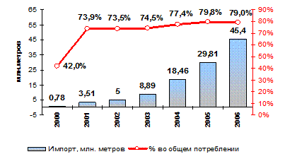 Доля импорта в потреблении металлопластиковых труб, млн. метров