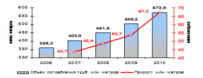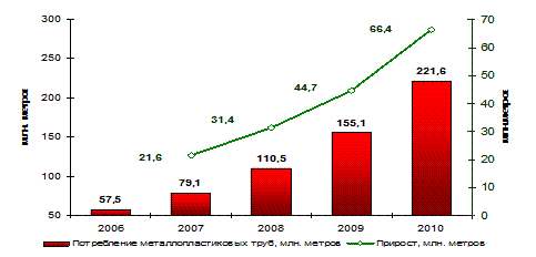 Потребление металлопластиковых труб будет расти наиболее высокими темпами. За счет лучших потребительских и ценовых качеств, трубы PERT-Al-PERT практически вытеснят трубы PEX-Al-PEX, и усилит разрыв с армированными полипропиленовыми трубами. Наиболее вероятен компромиссный вариант: В сегменте внутриквартирных разводок и теплых полов, будет доминировать металлопластиковые трубы, а для стояков и внутриквартальных разводок будет применяться полипропиленовые трубы. Однако, с появлением сварных фитингов большого диаметра из PERT полиэтилена изменится ситуация и в этом сегменте. К 2010 году объем потребления металлопластиковых труб превысит объем потребления стальных. Прогноз потребления металлопластиковых труб млн. метров.