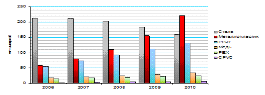 В отличие от европейского рынка, где существуют производства медных труб, и доля на рынке, хоть и сокращается, но довольно существенна -18%, на российском рынке доля медных труб возрастет не более чем до 6-7%. Не смотря на дешевизну труб PE, PERT, CVPC, и относительно недорогого оборудования для их производств, доля полимерных уменьшиться до 3-4%. Из-за высокого температурного расширения монтаж таких труб существенно дороже остальных систем. Динамика потребления различных труб, млн. метров.