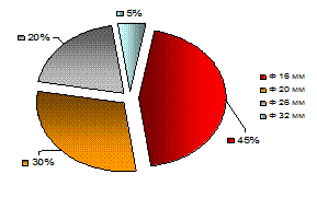 Фонд рабочего времени. Для обеспечения качества выпускаемой продукции необходим круглосуточный режим работы. С учетом выходных, праздничных дней расчетный годовой фонд рабочего времени планируется 5520 часов (230 рабочих дней) Ассортимент. Статистический анализ продаж и применения труб различных диаметров при комплектации объектов показывает, что наиболее востребованные МПТ Ø 16 и Ø 20 мм. Однако следует отметить тенденцию увеличения спроса на трубы большого диаметра. Структура спроса на МПТ различного диаметра в регионе 2005 - 2007 год