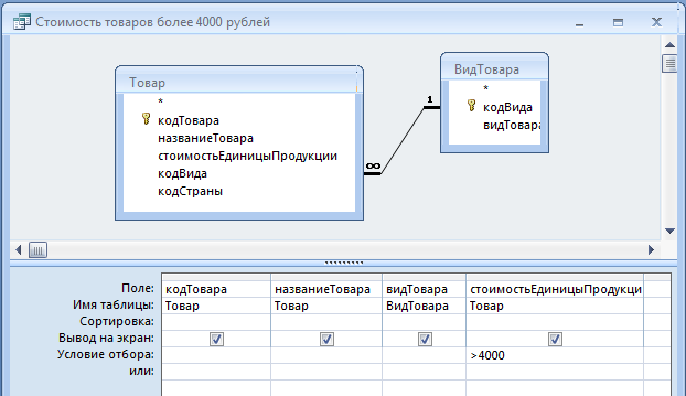 Рисунок 14 – Запрос «Стоимость товаров более 4000 рублей» в режиме конструктора Результат запроса в режиме таблицы представлен на рисунке 15