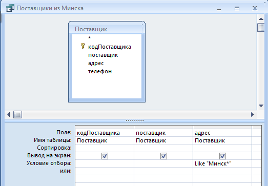 Рисунок 16 – Запрос « Поставщики из Минска» в режиме конструктора Результат запроса в режиме таблицы представлен на рисунке 17