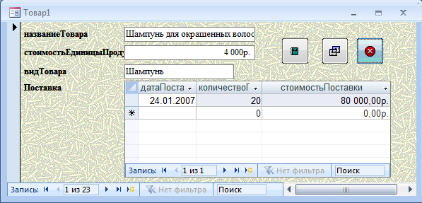 Рисунок 32 – Форма «Товар» Таким же образом создаем ещё одну форму «Поставщики». Выбираем создание формы с помощью мастера. В появившемся окне выбираем таблицу «Поставщик» и из нее добавляем поля «Поставщик», «Адрес» и «Телефон». Далее добавляем таблицу «Поставка» и из нее выбираем поля «Код поставки», «Стоимость поставки» и «Количество поставленных единиц». Нажимаем кнопку «Далее». Появляется окно «Выберите вид представления данных». Здесь мы ничего не меняем, так как сначала мы выбрали главную, а затем подчинённую таблицу. По умолчанию стоит пункт «Подчинённые формы». Нажимаем кнопку «Далее». Появляется окно «Выберите внешний вид подчинённой формы». Выбираем вид «табличный», нажимаем кнопку «Далее». В окне «Выберите требуемый стиль» отмечаем мышкой стиль «Международный». Нажимаем кнопку «Готово». Далее переходим в режим конструктора. На панели элементов выбираем элемент «Кнопка». Переносим его на форму. Появляется диалоговое окно «Создание кнопок». Выбираем пункты: «Работа с отчётом» и «Просмотр отчёта». В следующем окне выбираем отчёт «Вид товара». Нажимаем кнопку «Готово». Таким же образом добавляем вторую кнопку. Переносим её на форму, в диалоговом окне выбираем: «Разное» и «Выполнить запрос». Далее выбираем «Количество поставок», нажимаем кнопку «Готово». Добавляем третью кнопку. Переносим её на форму, в диалоговом окне выбираем: «Приложение» и «Выйти из приложения». Нажимаем кнопку «Готово». Форма «Поставщик» представлена на рисунке 33.