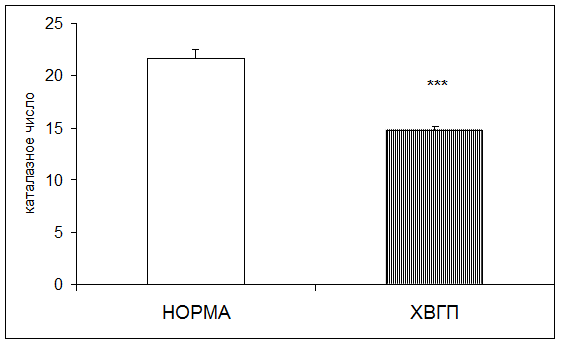 Рис. 3. Содержание пептидов средней молекулярной массы в плаценте в норме и при хронической внутриутробной гипоксии плода (мкг/мл; * - р<0,05; ** - р<0,01; *** - р<0,001 относительно нормы) Повышение содержания пептидов средней молекулярной массы может быть связано с повышением активности катепсина D[14]. 3.3. Активность каталазы в плацентарной ткани в норме и при хронической внутриутробной гипоксии плода Результаты исследования показали достоверное понижение активности каталазы в плацентарной ткани при хронической внутриутробной гипоксии плода в 1,46 раза по отношению к норме (рис. 4).