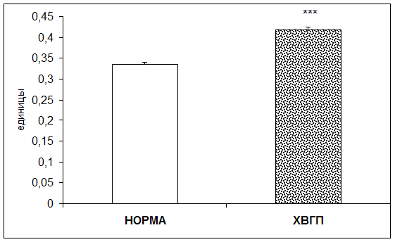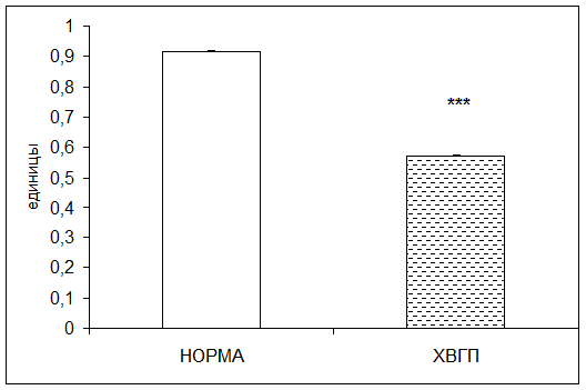 Рис. 7. Активность триеновых коньюгатов в плацентарной ткани в норме и при хронической внутриутробной гипоксии плода (единицы; * - р<0,05; ** - р<0,01; *** - р<0,001 относительно нормы) Понижение содержания диеновых и триеновых конъюгатов может быть связано с усилением активности низкомолекулярных антиоксидантов – токоферола и ретинола, содержание которых повышено в плацентарной ткани при изучаемой патологии [6]. 3.7. Концентрация гидроперекисей в плацентарной ткани в норме и при хронической внутриутробной гипоксии плода Согласно результатам исследования при хронической внутриутробной гипоксии плода концентрация гидроперекисей в плацентарной ткани повышалась в 1,25 раза по отношению к норме (рис. 8).