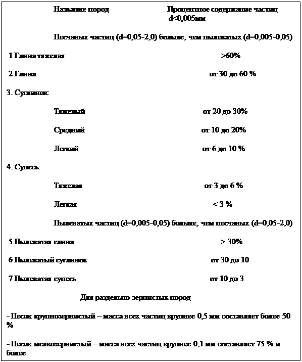 q Метод пипетки – оценка гранулярного состава песчано-глинистых пород через скорость осаждения частиц в приготовленной суспензии. Отбор проб суспензии через определенный интервал времени пипеткой с различной глубины с последующим высушиванием и взвешиванием. Основной способ изображения гранулярного состава песчано-глинистых пород – кривая в полулогарифмическом масштабе. Породы делятся по размерам частиц: валуны (камни) – более 200мм, галька (щебень) – 10-20мм; гравий (дресва) – 2-10мм; пески – 0,05-2мм; пыль – 0,005-0,05мм; глины - <0,005мм. Количественный показатель гранулярной кривой – коэффициент неоднородности Кн = d 60 / d 10 , где d 60 и d 10 – контролирующий и эффективный диаметры, определяемые с кривой грансостава. Для однородных пород Кн 1, равномерным распределением фракций - Кн = 25 – 100 (песок считается однородным при Кн <3. Классификация глинистых пород по грансоставу