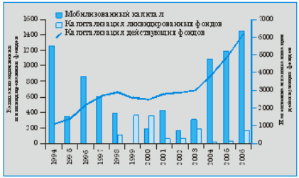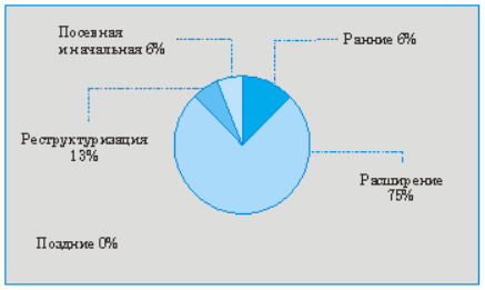 Рис. 3.1 – Капитализация венчурных фондов и фондов прямых инвестиций в России, млн. долл Следует отметить, что около 100 млн. долл. было привлечено 13 фондами, созданными в форме закрытых паевых инвестиционных фондов особо рисковых (венчурных) инвестиций (ЗПИФВ) (в 2007 году - 30 млн. долл.). Такая динамика связана, прежде всего, с завершением в ряде регионов конкурсов по выбору управляющих компаний для создаваемых по инициативе МЭРТ региональных венчурных фондов инвестиций в малые предприятия в научно-технической сфере (высоких технологий). Отток капитала с рынка прямых и венчурных инвестиций в 2008 году составил порядка 172,7 млн долл., что многократно превышает данный показатель за 2007 год (10 млн долл.). Это связано с завершением работы трех фондов. Один из фондов закрылся в связи с изменением корпоративной политики, ликвидация другого связана отсутствием коммерчески привлекательных проектов в сфере интересов фонда, третий фонд успешно завершил свою работу и перешел в стадию ликвидации. Вложения в наукоемкие отрасли (особенно в компании ранних стадий) по-прежнему относительно невелики. Доля инвестиций на венчурных стадиях в общем объеме вложенных средств осталась на том же уровне – примерно 11,5% от общего объема вложенных средств за 2008 год. Вместе с тем рост вложений в венчурные стадии в денежном выражении по сравнению с 2007 годом увеличился в 2,6 раза. Однако следует отметить, что количество сделок на венчурных стадиях по сравнению с 2007 годом увеличилось только в 2 раза. Возможно, данная ситуация претерпит существенные изменения в связи с разворачиванием деятельности различных фондов венчурных инвестиций с государственным участием, декларирующих в качестве своих приоритетов инвестиции в компании ранних стадий из наукоемких секторов.